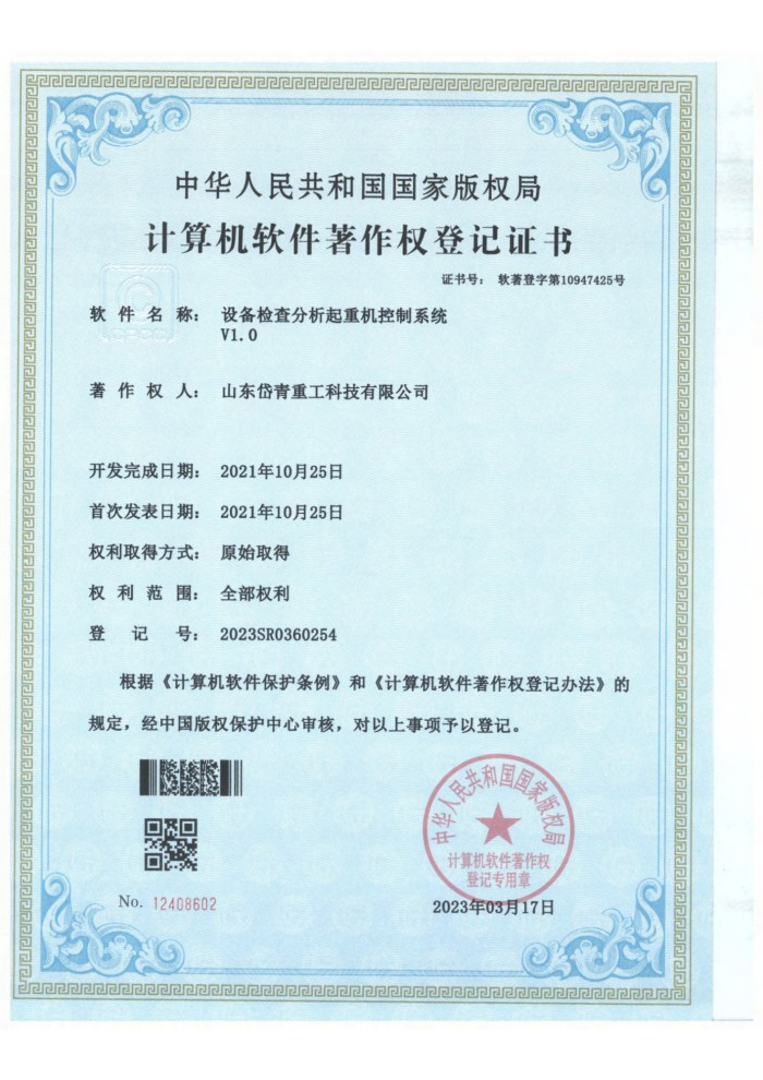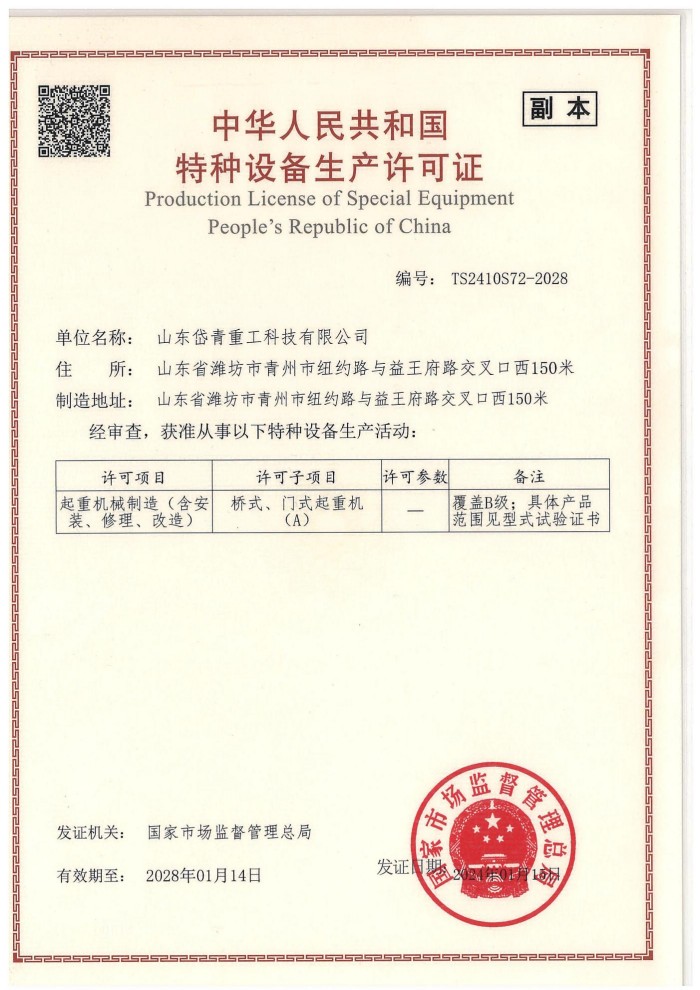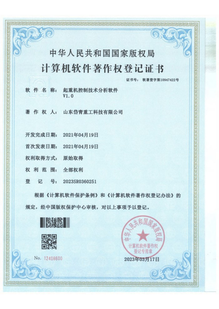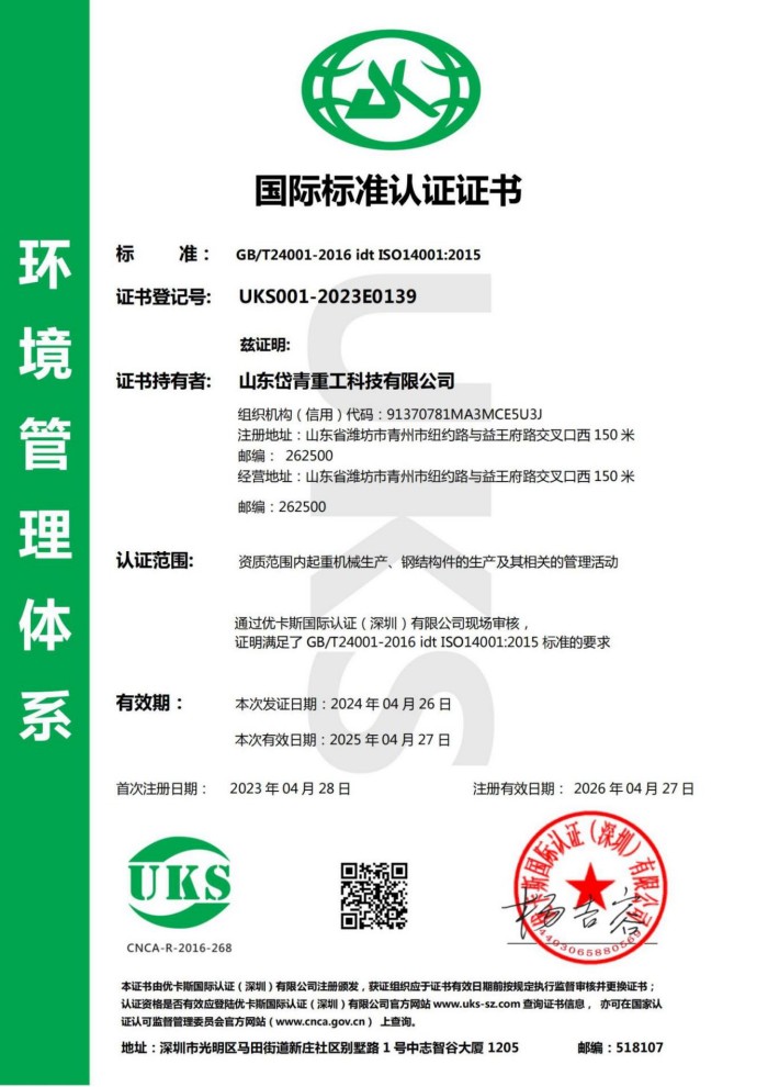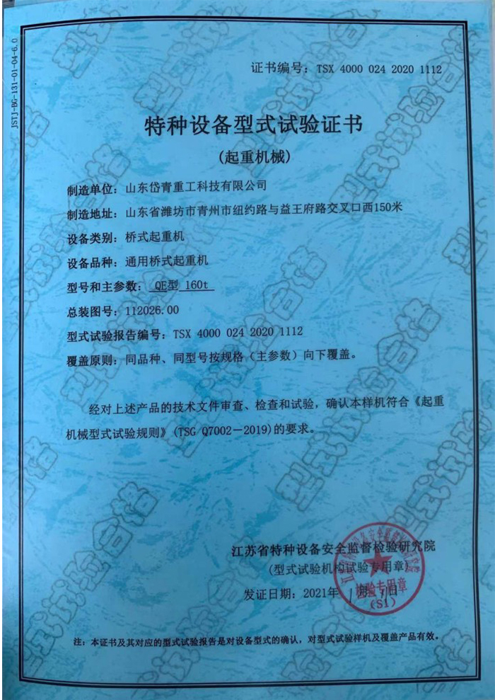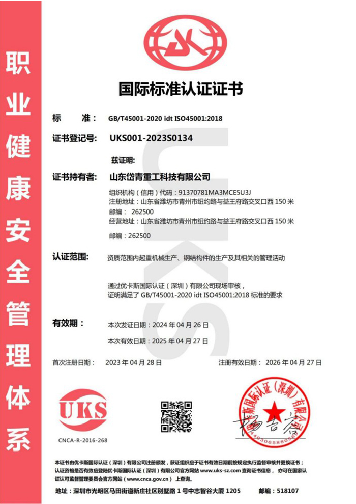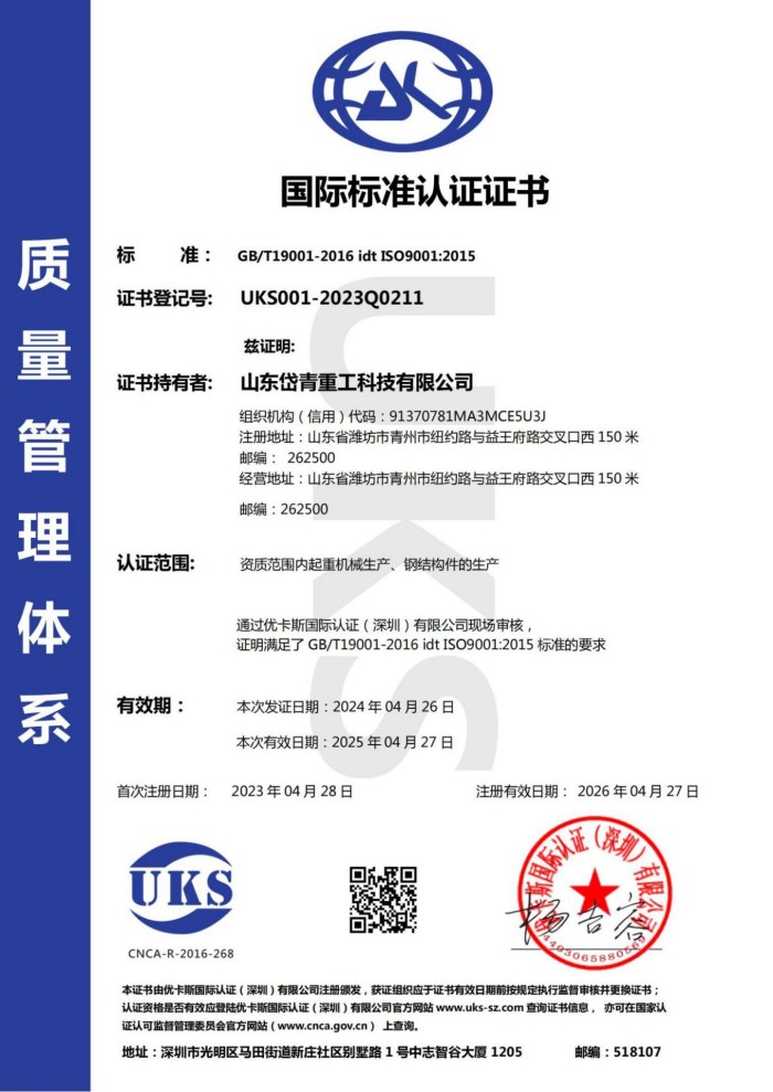 Компания получила квалификацию уровня А на производство, монтаж, техническое обслуживание и ремонт кранов, выданную Главным управлением по надзору за качеством, инспекции и карантину, а также прошла сертификацию системы качества ISO9001 и системы менеджмента охраны труда и техники безопасности. Компания обладает комплексной системой обеспечения качества, строгими процедурами управления, мощными производственными и вспомогательными возможностями, а также передовыми методами испытаний.