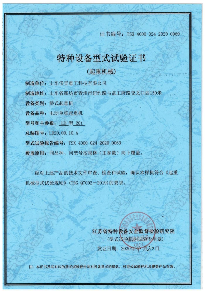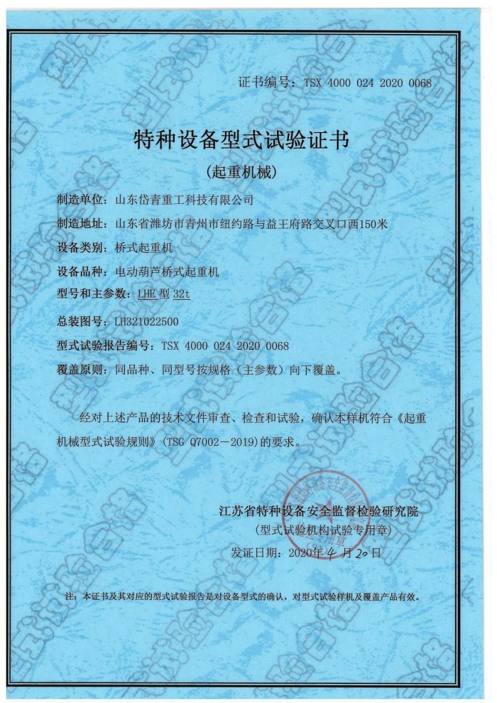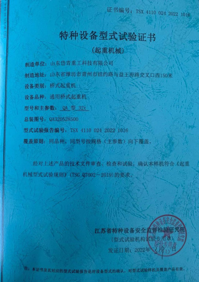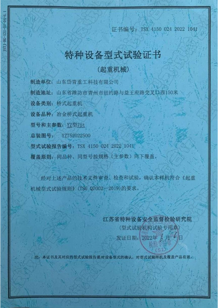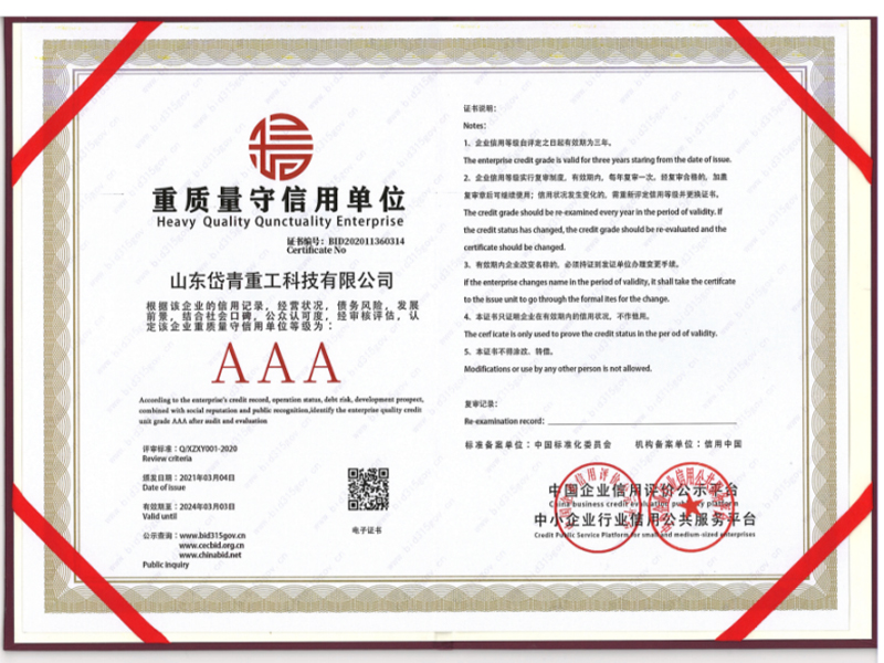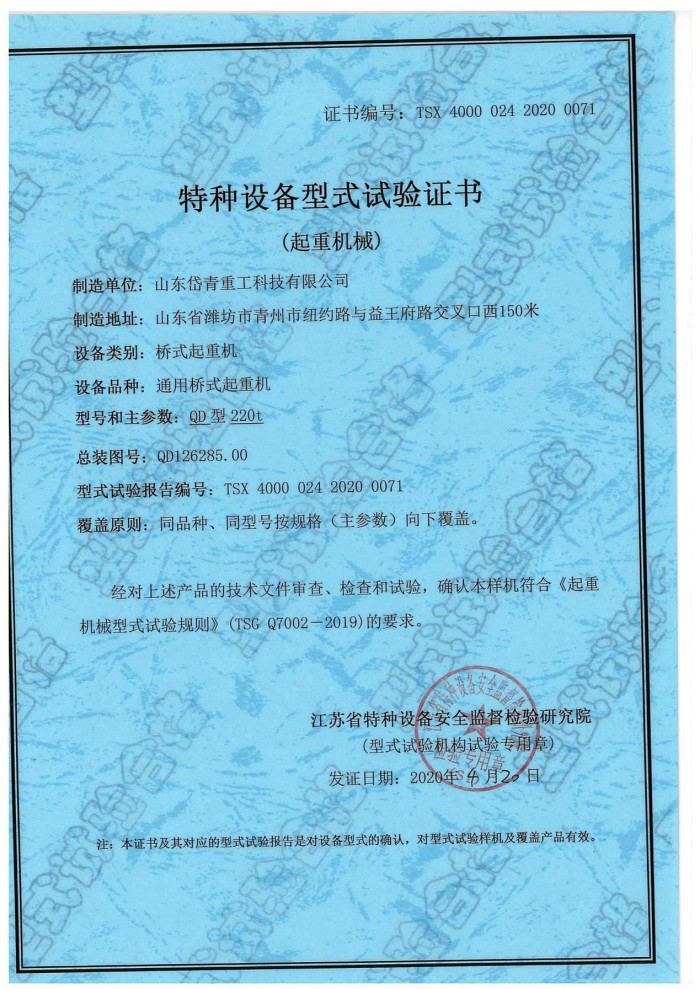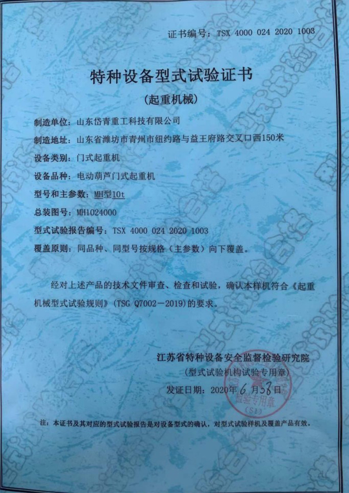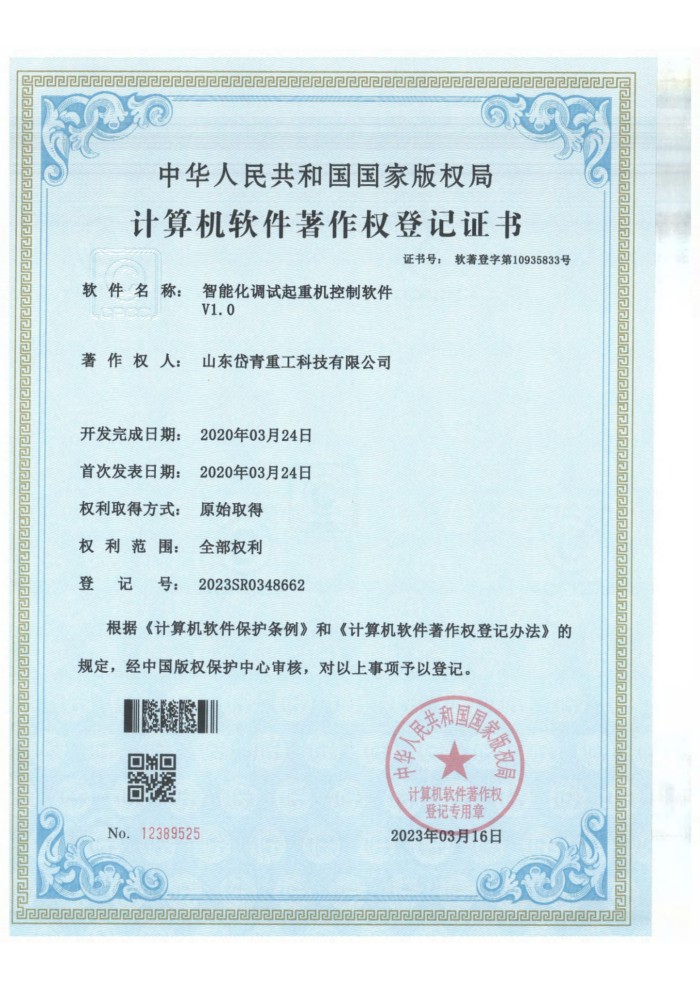 Компания получила квалификацию уровня А на производство, монтаж, техническое обслуживание и ремонт кранов, выданную Главным управлением по надзору за качеством, инспекции и карантину, а также прошла сертификацию системы качества ISO9001 и системы менеджмента охраны труда и техники безопасности. Компания обладает комплексной системой обеспечения качества, строгими процедурами управления, мощными производственными и вспомогательными возможностями, а также передовыми методами испытаний.